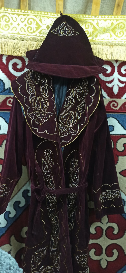 Kazakh traditional garments – male velvet robe and headdress decorated with traditional embroidery.